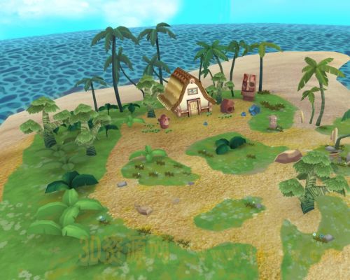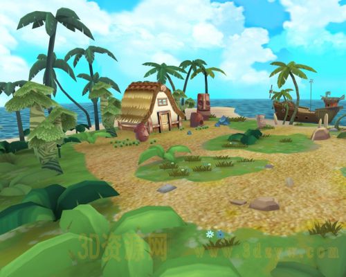 卡通Q版海滩 海岛小岛沙滩椰子树小屋船3d模型
